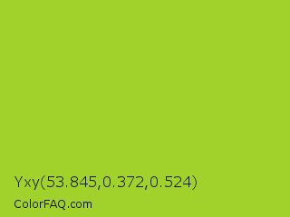 Yxy 53.845,0.372,0.524 Color is a normal lime color and the nearest color is Yellow Green #9acd32. Hex code #a1d22b and RGB value is rgb(161,210,43). In RGB color space, this color is composed of 63% red, 82% green, 17% blue, In CMYK color space, this color is composed of 23% cyan, 0% magenta, 80% yellow , 18% black , In HSL color space, this color has a hue angle of 78° , 66% saturation and 50% lightness.