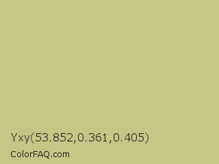 Yxy 53.852,0.361,0.405 Color is a light yellow color and the nearest color is Pine Glade #c7cd90. Hex code #c7c588 and RGB value is rgb(199,197,136). In RGB color space, this color is composed of 78% red, 77% green, 53% blue, In CMYK color space, this color is composed of 0% cyan, 1% magenta, 32% yellow , 22% black , In HSL color space, this color has a hue angle of 58° , 36% saturation and 66% lightness.