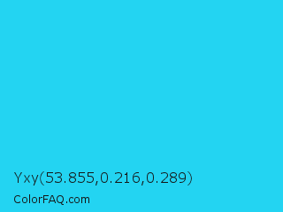 Yxy 53.855,0.216,0.289 Color is a normal cyan color and the nearest color is Spiro Disco Ball #0fc0fc. Hex code #23d4f2 and RGB value is rgb(35,212,242). In RGB color space, this color is composed of 14% red, 83% green, 95% blue, In CMYK color space, this color is composed of 86% cyan, 12% magenta, 0% yellow , 5% black , In HSL color space, this color has a hue angle of 189° , 89% saturation and 54% lightness.