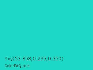 Yxy 53.858,0.235,0.359 Color is a normal cyan color and the nearest color is Turquoise PWG #30d5c8. Hex code #1bd9c4 and RGB value is rgb(27,217,196). In RGB color space, this color is composed of 11% red, 85% green, 77% blue, In CMYK color space, this color is composed of 88% cyan, 0% magenta, 10% yellow , 15% black , In HSL color space, this color has a hue angle of 173° , 78% saturation and 48% lightness.