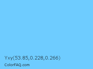 Yxy 53.85,0.228,0.266 Color is a light blue color and the nearest color is Maya Blue #73c2fb. Hex code #6eccff and RGB value is rgb(110,204,255). In RGB color space, this color is composed of 43% red, 80% green, 100% blue, In CMYK color space, this color is composed of 57% cyan, 20% magenta, 0% yellow , 0% black , In HSL color space, this color has a hue angle of 201° , 100% saturation and 72% lightness.