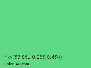 Yxy 53.861,0.286,0.454 Color is a light green color and the nearest color is Very Light Malachite Green #64e986. Hex code #60d985 and RGB value is rgb(96,217,133). In RGB color space, this color is composed of 38% red, 85% green, 52% blue, In CMYK color space, this color is composed of 56% cyan, 0% magenta, 39% yellow , 15% black , In HSL color space, this color has a hue angle of 138° , 61% saturation and 61% lightness.