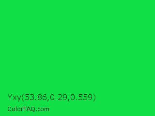 Yxy 53.86,0.29,0.559 Color is a normal green color and the nearest color is Malachite #0bda51. Hex code #10e045 and RGB value is rgb(16,224,69). In RGB color space, this color is composed of 6% red, 88% green, 27% blue, In CMYK color space, this color is composed of 93% cyan, 0% magenta, 69% yellow , 12% black , In HSL color space, this color has a hue angle of 135° , 87% saturation and 47% lightness.