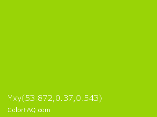 Yxy 53.872,0.37,0.543 Color is a normal lime color and the nearest color is Sheen Green #8fd400. Hex code #99d406 and RGB value is rgb(153,212,6). In RGB color space, this color is composed of 60% red, 83% green, 2% blue, In CMYK color space, this color is composed of 28% cyan, 0% magenta, 97% yellow , 17% black , In HSL color space, this color has a hue angle of 77° , 94% saturation and 43% lightness.