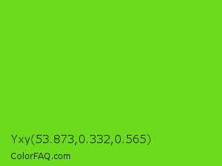 Yxy 53.873,0.332,0.565 Color is a normal green color and the nearest color is Lima #76bd17. Hex code #6cdb1c and RGB value is rgb(108,219,28). In RGB color space, this color is composed of 42% red, 86% green, 11% blue, In CMYK color space, this color is composed of 51% cyan, 0% magenta, 87% yellow , 14% black , In HSL color space, this color has a hue angle of 95° , 77% saturation and 48% lightness.