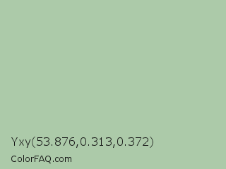 Yxy 53.876,0.313,0.372 Color is a light green color and the nearest color is Spring Rain #accbb1. Hex code #accaa9 and RGB value is rgb(172,202,169). In RGB color space, this color is composed of 67% red, 79% green, 66% blue, In CMYK color space, this color is composed of 15% cyan, 0% magenta, 16% yellow , 21% black , In HSL color space, this color has a hue angle of 115° , 24% saturation and 73% lightness.