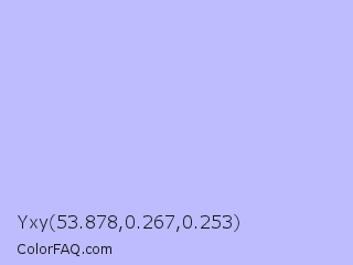 Yxy 53.878,0.267,0.253 Color is a very light blue color and the nearest color is Melrose #c7c1ff. Hex code #bcbcff and RGB value is rgb(188,188,255). In RGB color space, this color is composed of 74% red, 74% green, 100% blue, In CMYK color space, this color is composed of 26% cyan, 26% magenta, 0% yellow , 0% black , In HSL color space, this color has a hue angle of 240° , 100% saturation and 87% lightness.