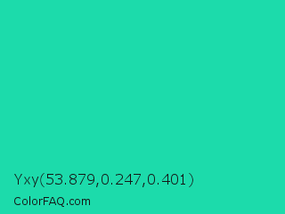Yxy 53.879,0.247,0.401 Color is a normal cyan color and the nearest color is Shamrock #33cc99. Hex code #1cdbab and RGB value is rgb(28,219,171). In RGB color space, this color is composed of 11% red, 86% green, 67% blue, In CMYK color space, this color is composed of 87% cyan, 0% magenta, 22% yellow , 14% black , In HSL color space, this color has a hue angle of 165° , 77% saturation and 48% lightness.