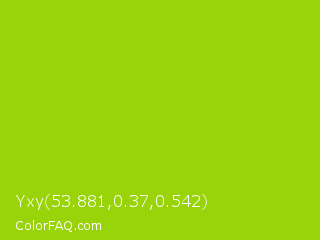 Yxy 53.881,0.37,0.542 Color is a normal lime color and the nearest color is Vivid Lime Green #a6d608. Hex code #99d40a and RGB value is rgb(153,212,10). In RGB color space, this color is composed of 60% red, 83% green, 4% blue, In CMYK color space, this color is composed of 28% cyan, 0% magenta, 95% yellow , 17% black , In HSL color space, this color has a hue angle of 78° , 91% saturation and 44% lightness.