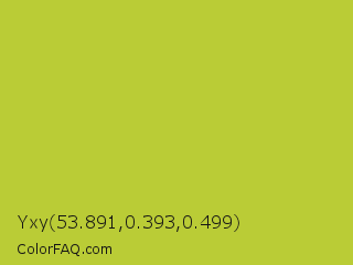 Yxy 53.891,0.393,0.499 Color is a normal yellow color and the nearest color is Key Lime Pie #bfc921. Hex code #bacc36 and RGB value is rgb(186,204,54). In RGB color space, this color is composed of 73% red, 80% green, 21% blue, In CMYK color space, this color is composed of 9% cyan, 0% magenta, 74% yellow , 20% black , In HSL color space, this color has a hue angle of 67° , 60% saturation and 51% lightness.