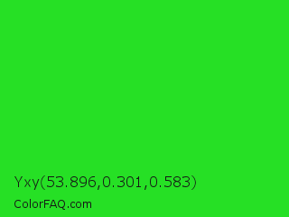 Yxy 53.896,0.301,0.583 Color is a normal green color and the nearest color is Lime Green #32cd32. Hex code #26e025 and RGB value is rgb(38,224,37). In RGB color space, this color is composed of 15% red, 88% green, 15% blue, In CMYK color space, this color is composed of 83% cyan, 0% magenta, 83% yellow , 12% black , In HSL color space, this color has a hue angle of 120° , 75% saturation and 51% lightness.