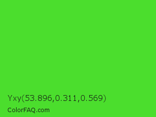 Yxy 53.896,0.311,0.569 Color is a normal green color and the nearest color is Harlequin Green #46cb18. Hex code #4bde2d and RGB value is rgb(75,222,45). In RGB color space, this color is composed of 29% red, 87% green, 18% blue, In CMYK color space, this color is composed of 66% cyan, 0% magenta, 80% yellow , 13% black , In HSL color space, this color has a hue angle of 110° , 73% saturation and 52% lightness.