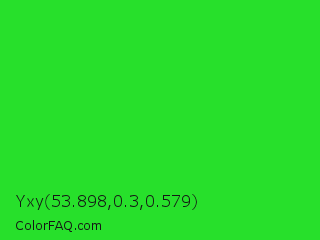 Yxy 53.898,0.3,0.579 Color is a normal green color and the nearest color is Lime Green #32cd32. Hex code #27e02b and RGB value is rgb(39,224,43). In RGB color space, this color is composed of 15% red, 88% green, 17% blue, In CMYK color space, this color is composed of 83% cyan, 0% magenta, 81% yellow , 12% black , In HSL color space, this color has a hue angle of 121° , 75% saturation and 52% lightness.