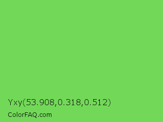 Yxy 53.908,0.318,0.512 Color is a normal green color and the nearest color is Mantis #74c365. Hex code #72d958 and RGB value is rgb(114,217,88). In RGB color space, this color is composed of 45% red, 85% green, 35% blue, In CMYK color space, this color is composed of 47% cyan, 0% magenta, 59% yellow , 15% black , In HSL color space, this color has a hue angle of 108° , 63% saturation and 60% lightness.