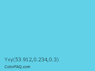 Yxy 53.912,0.234,0.3 Color is a light cyan color and the nearest color is Viking #64ccdb. Hex code #60d1e7 and RGB value is rgb(96,209,231). In RGB color space, this color is composed of 38% red, 82% green, 91% blue, In CMYK color space, this color is composed of 58% cyan, 10% magenta, 0% yellow , 9% black , In HSL color space, this color has a hue angle of 190° , 74% saturation and 64% lightness.
