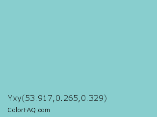 Yxy 53.917,0.265,0.329 Color is a light cyan color and the nearest color is Monte Carlo #83d0c6. Hex code #88cece and RGB value is rgb(136,206,206). In RGB color space, this color is composed of 53% red, 81% green, 81% blue, In CMYK color space, this color is composed of 34% cyan, 0% magenta, 0% yellow , 19% black , In HSL color space, this color has a hue angle of 180° , 42% saturation and 67% lightness.