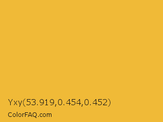Yxy 53.919,0.454,0.452 Color is a normal orange color and the nearest color is Tulip Tree #eab33b. Hex code #f0ba37 and RGB value is rgb(240,186,55). In RGB color space, this color is composed of 94% red, 73% green, 22% blue, In CMYK color space, this color is composed of 0% cyan, 23% magenta, 77% yellow , 6% black , In HSL color space, this color has a hue angle of 42° , 86% saturation and 58% lightness.