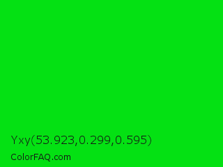 Yxy 53.923,0.299,0.595 Color is a normal green color and the nearest color is Green #00ff00. Hex code #04e113 and RGB value is rgb(4,225,19). In RGB color space, this color is composed of 2% red, 88% green, 7% blue, In CMYK color space, this color is composed of 98% cyan, 0% magenta, 92% yellow , 12% black , In HSL color space, this color has a hue angle of 124° , 97% saturation and 45% lightness.