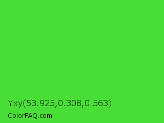 Yxy 53.925,0.308,0.563 Color is a normal green color and the nearest color is Lime Green #32cd32. Hex code #48de36 and RGB value is rgb(72,222,54). In RGB color space, this color is composed of 28% red, 87% green, 21% blue, In CMYK color space, this color is composed of 68% cyan, 0% magenta, 76% yellow , 13% black , In HSL color space, this color has a hue angle of 114° , 72% saturation and 54% lightness.