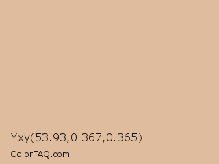 Yxy 53.93,0.367,0.365 Color is a light orange color and the nearest color is Cameo #d9b99b. Hex code #debc9d and RGB value is rgb(222,188,157). In RGB color space, this color is composed of 87% red, 74% green, 62% blue, In CMYK color space, this color is composed of 0% cyan, 15% magenta, 29% yellow , 13% black , In HSL color space, this color has a hue angle of 29° , 50% saturation and 74% lightness.