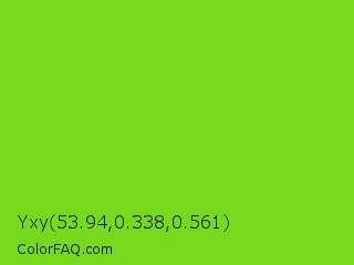 Yxy 53.94,0.338,0.561 Color is a normal green color and the nearest color is Lima #76bd17. Hex code #74da1b and RGB value is rgb(116,218,27). In RGB color space, this color is composed of 45% red, 85% green, 11% blue, In CMYK color space, this color is composed of 47% cyan, 0% magenta, 88% yellow , 15% black , In HSL color space, this color has a hue angle of 92° , 78% saturation and 48% lightness.