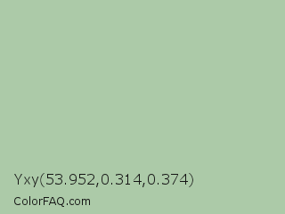 Yxy 53.952,0.314,0.374 Color is a light green color and the nearest color is Spring Rain #accbb1. Hex code #accaa8 and RGB value is rgb(172,202,168). In RGB color space, this color is composed of 67% red, 79% green, 66% blue, In CMYK color space, this color is composed of 15% cyan, 0% magenta, 17% yellow , 21% black , In HSL color space, this color has a hue angle of 113° , 24% saturation and 73% lightness.
