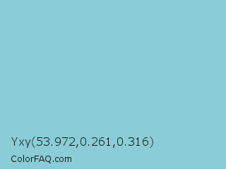Yxy 53.972,0.261,0.316 Color is a light cyan color and the nearest color is Half Baked #85c4cc. Hex code #8acdd7 and RGB value is rgb(138,205,215). In RGB color space, this color is composed of 54% red, 80% green, 84% blue, In CMYK color space, this color is composed of 36% cyan, 5% magenta, 0% yellow , 16% black , In HSL color space, this color has a hue angle of 188° , 49% saturation and 69% lightness.