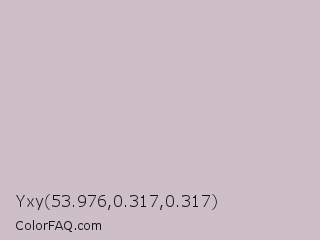 Yxy 53.976,0.317,0.317 Color is a light magenta color and the nearest color is Pale Slate #c3bfc1. Hex code #cdbec8 and RGB value is rgb(205,190,200). In RGB color space, this color is composed of 80% red, 75% green, 78% blue, In CMYK color space, this color is composed of 0% cyan, 7% magenta, 2% yellow , 20% black , In HSL color space, this color has a hue angle of 320° , 13% saturation and 77% lightness.