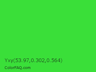 Yxy 53.97,0.302,0.564 Color is a normal green color and the nearest color is Lime Green #32cd32. Hex code #3adf39 and RGB value is rgb(58,223,57). In RGB color space, this color is composed of 23% red, 87% green, 22% blue, In CMYK color space, this color is composed of 74% cyan, 0% magenta, 74% yellow , 13% black , In HSL color space, this color has a hue angle of 120° , 72% saturation and 55% lightness.