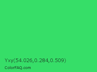 Yxy 54.026,0.284,0.509 Color is a normal green color and the nearest color is UFO Green #3cd070. Hex code #36de68 and RGB value is rgb(54,222,104). In RGB color space, this color is composed of 21% red, 87% green, 41% blue, In CMYK color space, this color is composed of 76% cyan, 0% magenta, 53% yellow , 13% black , In HSL color space, this color has a hue angle of 138° , 72% saturation and 54% lightness.