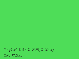 Yxy 54.037,0.299,0.525 Color is a normal green color and the nearest color is UFO Green #3cd070. Hex code #4edd58 and RGB value is rgb(78,221,88). In RGB color space, this color is composed of 31% red, 87% green, 35% blue, In CMYK color space, this color is composed of 65% cyan, 0% magenta, 60% yellow , 13% black , In HSL color space, this color has a hue angle of 124° , 68% saturation and 59% lightness.
