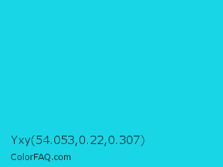 Yxy 54.053,0.22,0.307 Color is a normal cyan color and the nearest color is Bright Turquoise #08e8de. Hex code #18d6e6 and RGB value is rgb(24,214,230). In RGB color space, this color is composed of 9% red, 84% green, 90% blue, In CMYK color space, this color is composed of 90% cyan, 7% magenta, 0% yellow , 10% black , In HSL color space, this color has a hue angle of 185° , 81% saturation and 50% lightness.