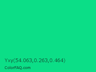 Yxy 54.063,0.263,0.464 Color is a normal green color and the nearest color is Caribbean Green #00cc99. Hex code #0bde87 and RGB value is rgb(11,222,135). In RGB color space, this color is composed of 4% red, 87% green, 53% blue, In CMYK color space, this color is composed of 95% cyan, 0% magenta, 39% yellow , 13% black , In HSL color space, this color has a hue angle of 155° , 91% saturation and 46% lightness.