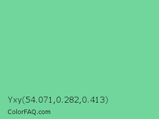 Yxy 54.071,0.282,0.413 Color is a light green color and the nearest color is Medium Aquamarine #66ddaa. Hex code #71d69c and RGB value is rgb(113,214,156). In RGB color space, this color is composed of 44% red, 84% green, 61% blue, In CMYK color space, this color is composed of 47% cyan, 0% magenta, 27% yellow , 16% black , In HSL color space, this color has a hue angle of 146° , 55% saturation and 64% lightness.