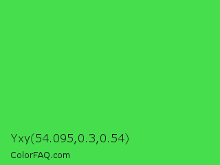 Yxy 54.095,0.3,0.54 Color is a normal green color and the nearest color is UFO Green #3cd070. Hex code #47de4e and RGB value is rgb(71,222,78). In RGB color space, this color is composed of 28% red, 87% green, 31% blue, In CMYK color space, this color is composed of 68% cyan, 0% magenta, 65% yellow , 13% black , In HSL color space, this color has a hue angle of 123° , 70% saturation and 57% lightness.