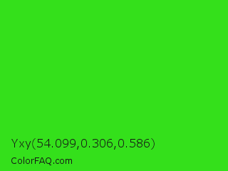 Yxy 54.099,0.306,0.586 Color is a normal green color and the nearest color is Harlequin Green #46cb18. Hex code #34e01b and RGB value is rgb(52,224,27). In RGB color space, this color is composed of 20% red, 88% green, 11% blue, In CMYK color space, this color is composed of 77% cyan, 0% magenta, 88% yellow , 12% black , In HSL color space, this color has a hue angle of 112° , 78% saturation and 49% lightness.