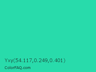 Yxy 54.117,0.249,0.401 Color is a normal cyan color and the nearest color is Shamrock #33cc99. Hex code #28dbab and RGB value is rgb(40,219,171). In RGB color space, this color is composed of 16% red, 86% green, 67% blue, In CMYK color space, this color is composed of 82% cyan, 0% magenta, 22% yellow , 14% black , In HSL color space, this color has a hue angle of 164° , 71% saturation and 51% lightness.