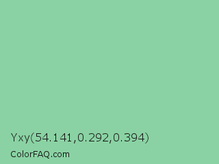 Yxy 54.141,0.292,0.394 Color is a light green color and the nearest color is Eton Blue #96c8a2. Hex code #8ad2a3 and RGB value is rgb(138,210,163). In RGB color space, this color is composed of 54% red, 82% green, 64% blue, In CMYK color space, this color is composed of 34% cyan, 0% magenta, 22% yellow , 18% black , In HSL color space, this color has a hue angle of 141° , 44% saturation and 68% lightness.