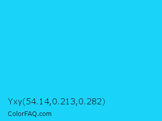 Yxy 54.14,0.213,0.282 Color is a normal cyan color and the nearest color is Spiro Disco Ball #0fc0fc. Hex code #19d4f8 and RGB value is rgb(25,212,248). In RGB color space, this color is composed of 10% red, 83% green, 97% blue, In CMYK color space, this color is composed of 90% cyan, 15% magenta, 0% yellow , 3% black , In HSL color space, this color has a hue angle of 190° , 94% saturation and 54% lightness.