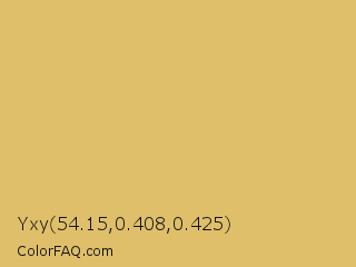 Yxy 54.15,0.408,0.425 Color is a light orange color and the nearest color is Apache #dfbe6f. Hex code #e0bf6a and RGB value is rgb(224,191,106). In RGB color space, this color is composed of 88% red, 75% green, 42% blue, In CMYK color space, this color is composed of 0% cyan, 15% magenta, 53% yellow , 12% black , In HSL color space, this color has a hue angle of 43° , 66% saturation and 65% lightness.