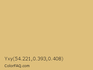 Yxy 54.221,0.393,0.408 Color is a light orange color and the nearest color is Harvest Gold #e0b974. Hex code #debf7b and RGB value is rgb(222,191,123). In RGB color space, this color is composed of 87% red, 75% green, 48% blue, In CMYK color space, this color is composed of 0% cyan, 14% magenta, 45% yellow , 13% black , In HSL color space, this color has a hue angle of 41° , 60% saturation and 68% lightness.