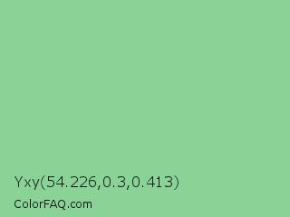 Yxy 54.226,0.3,0.413 Color is a light green color and the nearest color is Eton Blue #96c8a2. Hex code #8ad397 and RGB value is rgb(138,211,151). In RGB color space, this color is composed of 54% red, 83% green, 59% blue, In CMYK color space, this color is composed of 35% cyan, 0% magenta, 28% yellow , 17% black , In HSL color space, this color has a hue angle of 131° , 45% saturation and 68% lightness.