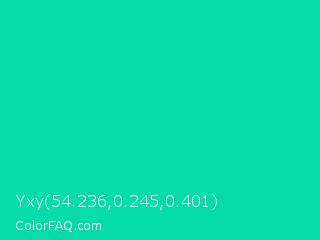 Yxy 54.236,0.245,0.401 Color is a normal cyan color and the nearest color is Amazonite #00c4b0. Hex code #05dcac and RGB value is rgb(5,220,172). In RGB color space, this color is composed of 2% red, 86% green, 67% blue, In CMYK color space, this color is composed of 98% cyan, 0% magenta, 22% yellow , 14% black , In HSL color space, this color has a hue angle of 167° , 96% saturation and 44% lightness.