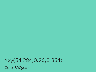 Yxy 54.284,0.26,0.364 Color is a light cyan color and the nearest color is Downy #6fd0c5. Hex code #69d5bc and RGB value is rgb(105,213,188). In RGB color space, this color is composed of 41% red, 84% green, 74% blue, In CMYK color space, this color is composed of 51% cyan, 0% magenta, 12% yellow , 16% black , In HSL color space, this color has a hue angle of 166° , 56% saturation and 62% lightness.