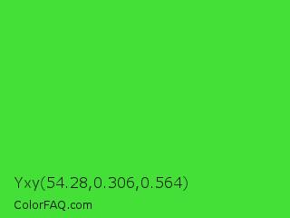 Yxy 54.28,0.306,0.564 Color is a normal green color and the nearest color is Lime Green #32cd32. Hex code #44df37 and RGB value is rgb(68,223,55). In RGB color space, this color is composed of 27% red, 87% green, 22% blue, In CMYK color space, this color is composed of 70% cyan, 0% magenta, 75% yellow , 13% black , In HSL color space, this color has a hue angle of 115° , 72% saturation and 55% lightness.