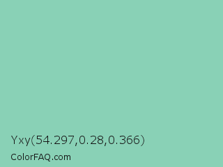 Yxy 54.297,0.28,0.366 Color is a light green color and the nearest color is Vista Blue #8fd6b4. Hex code #89d1b6 and RGB value is rgb(137,209,182). In RGB color space, this color is composed of 54% red, 82% green, 71% blue, In CMYK color space, this color is composed of 34% cyan, 0% magenta, 13% yellow , 18% black , In HSL color space, this color has a hue angle of 158° , 44% saturation and 68% lightness.