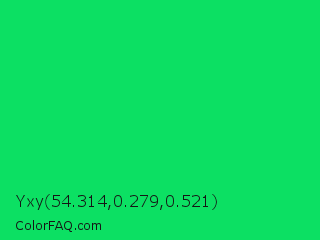 Yxy 54.314,0.279,0.521 Color is a normal green color and the nearest color is Malachite #0bda51. Hex code #0ce063 and RGB value is rgb(12,224,99). In RGB color space, this color is composed of 5% red, 88% green, 39% blue, In CMYK color space, this color is composed of 95% cyan, 0% magenta, 56% yellow , 12% black , In HSL color space, this color has a hue angle of 145° , 90% saturation and 46% lightness.