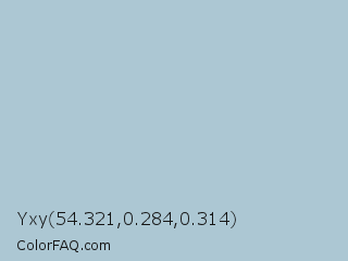 Yxy 54.321,0.284,0.314 Color is a light blue color and the nearest color is Pastel Blue #aec6cf. Hex code #acc7d3 and RGB value is rgb(172,199,211). In RGB color space, this color is composed of 67% red, 78% green, 83% blue, In CMYK color space, this color is composed of 18% cyan, 6% magenta, 0% yellow , 17% black , In HSL color space, this color has a hue angle of 198° , 31% saturation and 75% lightness.