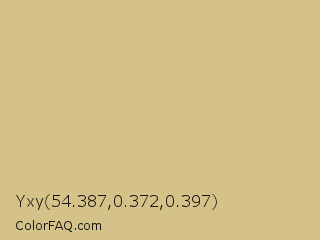 Yxy 54.387,0.372,0.397 Color is a light yellow color and the nearest color is Straw #d4bf8d. Hex code #d4c289 and RGB value is rgb(212,194,137). In RGB color space, this color is composed of 83% red, 76% green, 54% blue, In CMYK color space, this color is composed of 0% cyan, 8% magenta, 35% yellow , 17% black , In HSL color space, this color has a hue angle of 46° , 47% saturation and 68% lightness.