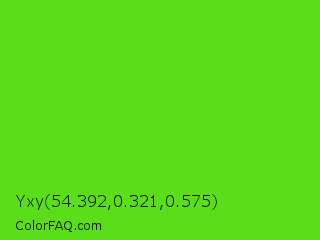 Yxy 54.392,0.321,0.575 Color is a normal green color and the nearest color is Harlequin Green #46cb18. Hex code #59de19 and RGB value is rgb(89,222,25). In RGB color space, this color is composed of 35% red, 87% green, 10% blue, In CMYK color space, this color is composed of 60% cyan, 0% magenta, 89% yellow , 13% black , In HSL color space, this color has a hue angle of 101° , 80% saturation and 48% lightness.